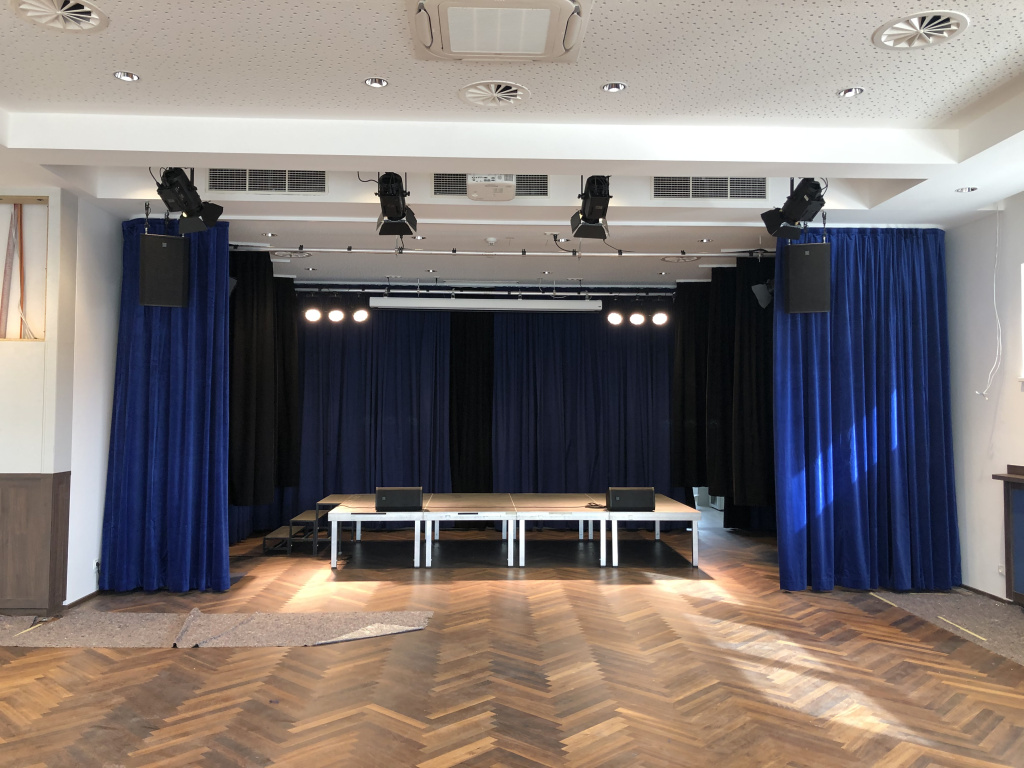 Der Veranstaltungssaal wurde zur universellen Nutzung durch die Gemeinde, so wie für externe Vermietung konzipiert. Beschallung, Bühnenbeleuchtung, Vorhangsystem, Projektion und Mediensteuerung für die simple Bedienung der Technik, so wie offene Schnittstellen für Gastproduktionen wurden konzipiert und in detaillierter Abstimmung mit der Architektur ins Gebäude integriert.