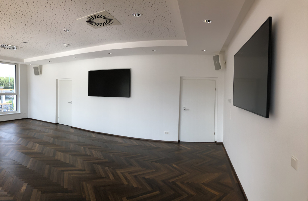 Der große Besprechungsraum bieten mit integrierter Beschallung und 2 großen Displays die Möglichkeit Besprechungen im größeren Rahmen, so wie kleine Veranstaltungen und Präsentationen abzuhalten.